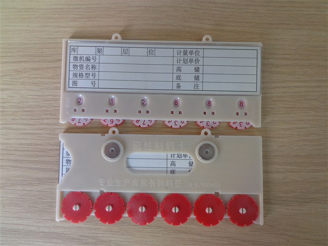 磁性標簽卡(磁性材料卡、材料卡、材料磁性卡、貨架標牌、磁性標牌、磁性標簽槽)適用于商場、文檔室、圖書館、倉庫等場所內(nèi),固定或吸附在文檔架、書架、貨架上標示該處物品信息的材料卡 磁性材料卡材質(zhì)ABS工程塑料,堅固耐用,背面裝有強磁材料或不粘膠,也可以使用開設(shè)在底扳上的掛壁式安裝孔固定,便于材料卡在不同材質(zhì)架上安裝。解決目前在工廠、商場等場所內(nèi)存儲大量物資所使用的該類倉儲卡信息不全或使用不便,而提供一種可隨時按需、靈活、方便更改材料數(shù)量,且結(jié)構(gòu)簡單、合理的材料卡,提高倉庫管理水平,以適應(yīng)企業(yè)的認證、升級。經(jīng)上千家企事業(yè)單位、部隊使用,效果良好