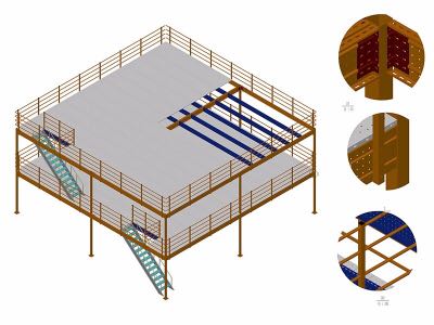 支撐柱采用承載力強(qiáng),各方向慣性矩均等的圓管,主梁和輔梁可根據(jù)承載需要選擇鋼結(jié)構(gòu)理論中為經(jīng)濟(jì)合理不同型號的H型鋼。樓板系統(tǒng)更能提供平板條形扣板、花紋鋼板條形扣板、鋼隔柵式樓板等3種選擇。
